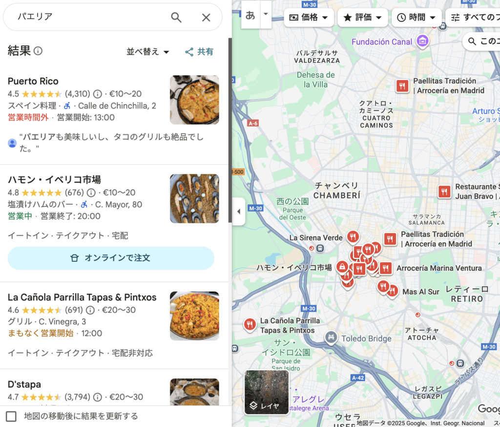 Google Maps も非常に便利で、「タパス」「パエリア」などの料理名で検索すれば、現在地から近い評価の高いレストランをすぐに見つけられます。